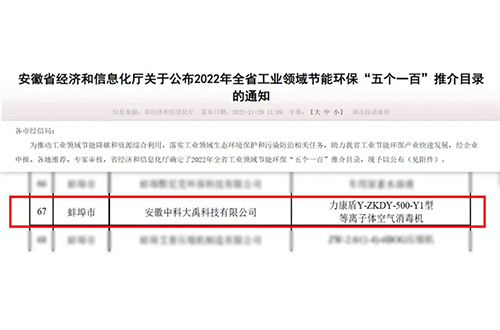 入選2023年全省工業領域節(jié)能環(huán)保“五個一百”推介目錄(節(jié)能環(huán)保新產品新裝備:G-ZKDY-2500-Y1型等離子體空氣消毒機)
