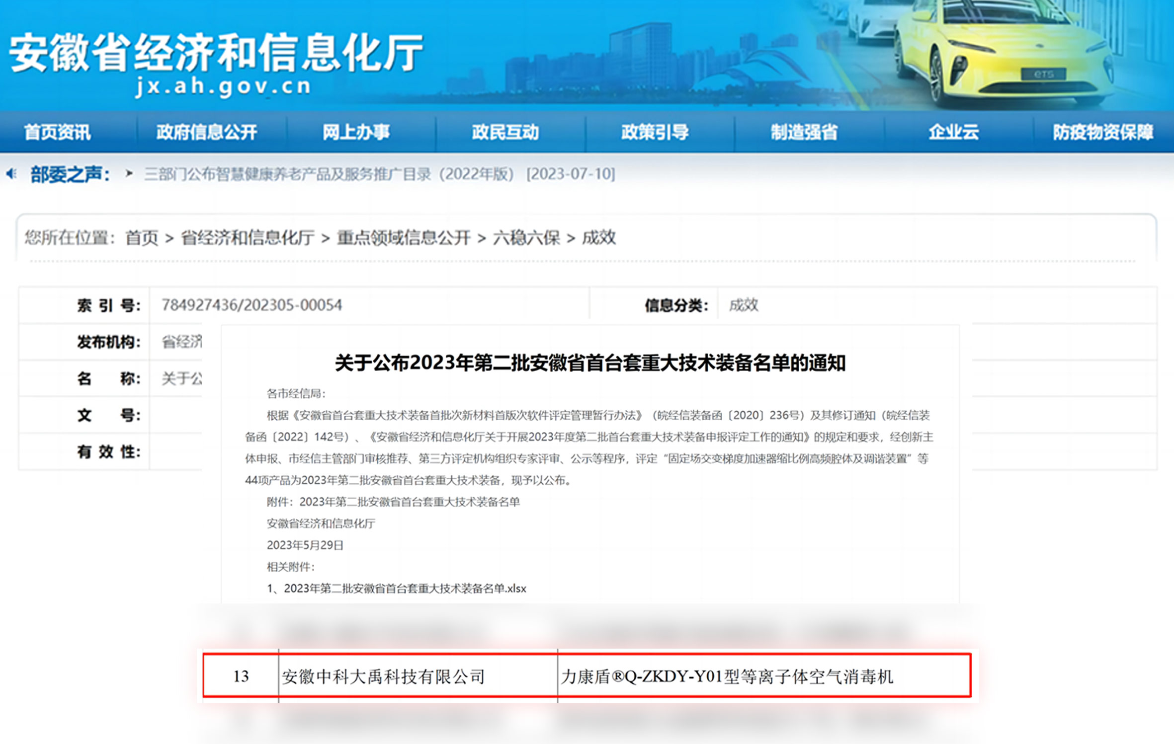 力康盾?ZKDY-G-180-P型等離子體空氣消毒機入選2024年度第三批安徽省首臺套重大技術裝備,評定等級:國內先進