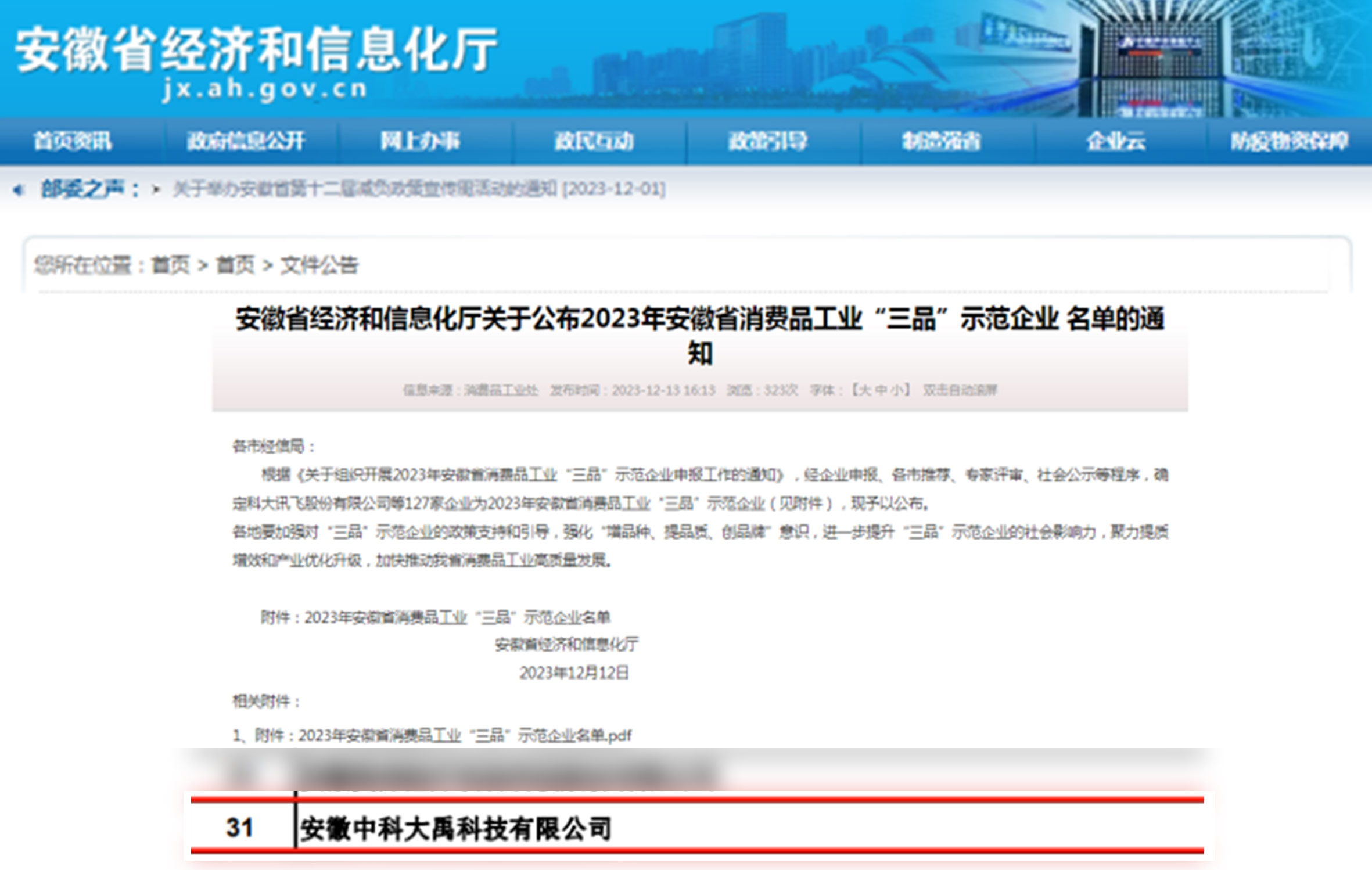 入選2023年安徽省消費品工業“三品”示范企業